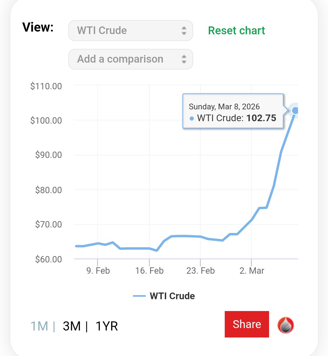 ii) WTI Crude reaches or exceeds the price listed at any point between market creation and before 11:59pm ET March 31st 2026, according oilprice.com
